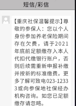 该短信由我市人力社保部门发送,主要用于提醒以个人身份参加企业职工基本养老保险的参保人及时完清缴费!