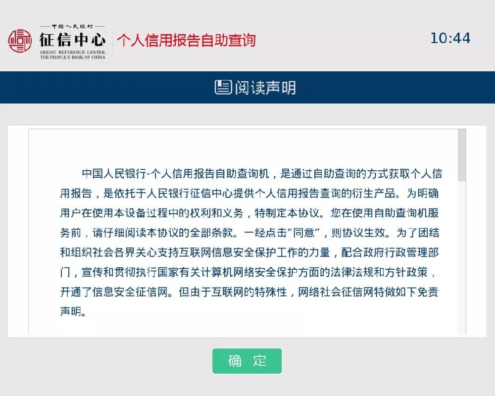 自助查询机的默认页面,阅读后请点击【确定】按钮。
