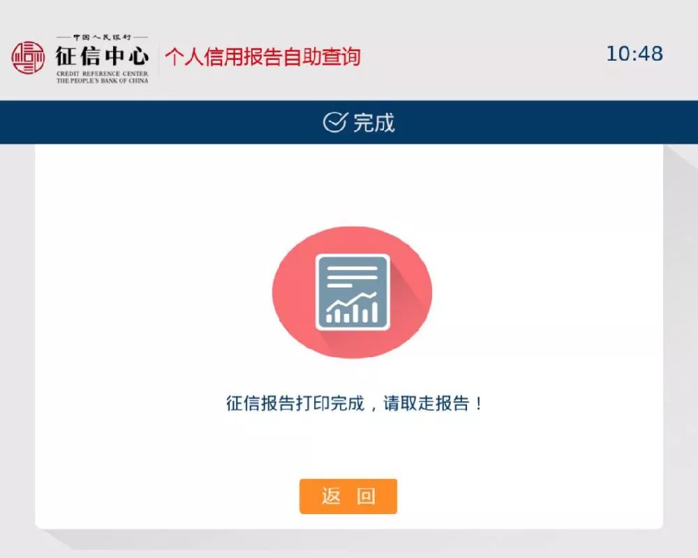 报告打印完成后,系统将提醒用户取走报告,并收好身份证。点击【返回】按钮,报告打印完成。