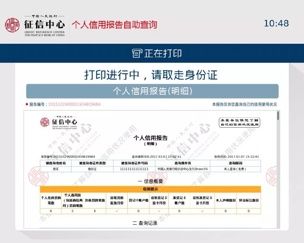 当查询费用缴纳完毕,或者查询本人报告未超过两次,在报告查询成功后,即可预览个人信用报告。系统将同步打印报告。