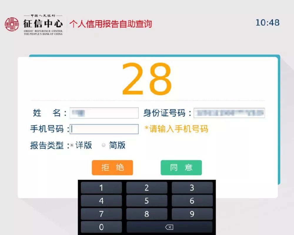 人脸比对通过后,请输入手机号码并选择报告类型。确认信息和手机号以及选择无误之后,点击【同意】按钮,页面将显示报告信息。