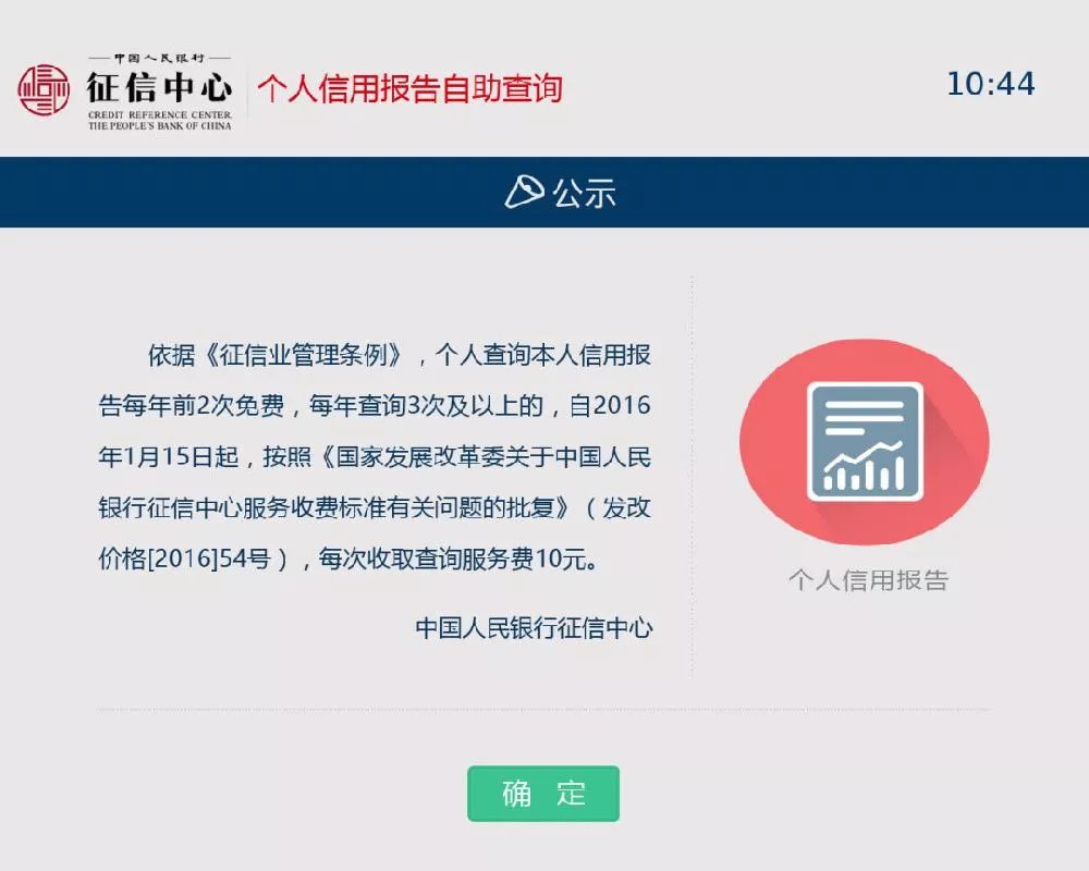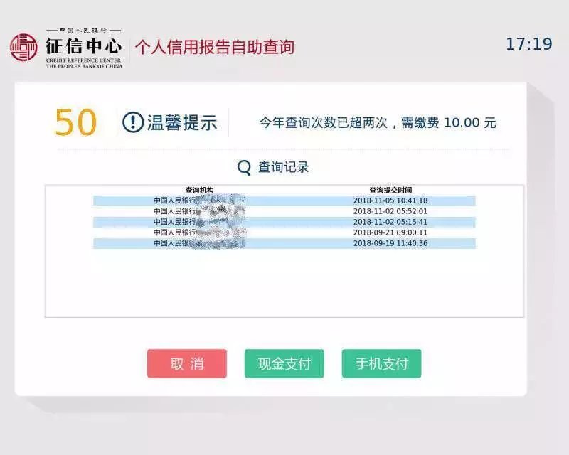 个人查询本人报告每年前两次免费,第三次及以上查询,按照有关规定,须每笔支付查询费人民币10元。如果当年查询已超过两次,页面将显示当年查询记录。