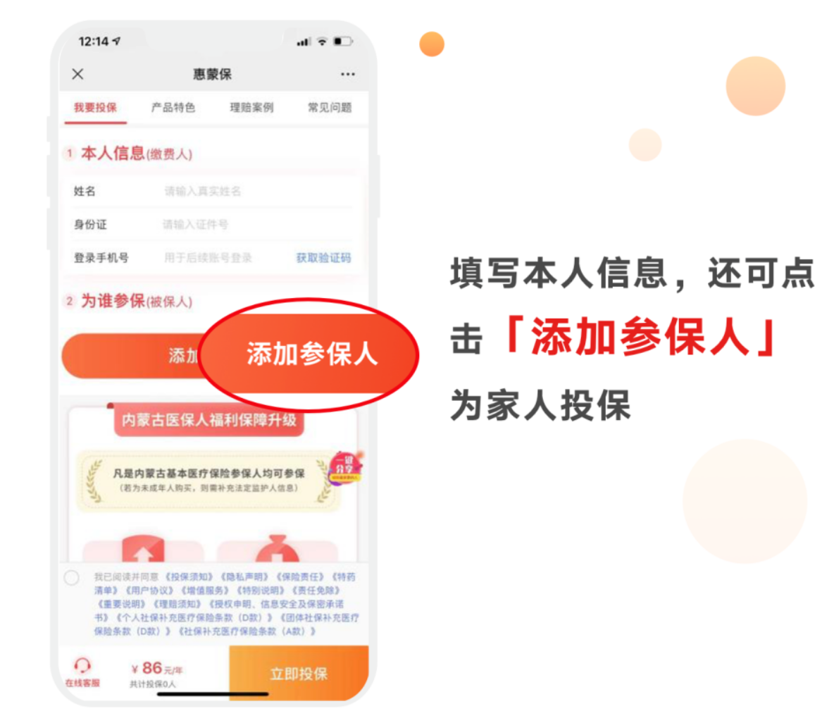 第二步:填写本人信息,还可点击“添加参保人”为家人投保。