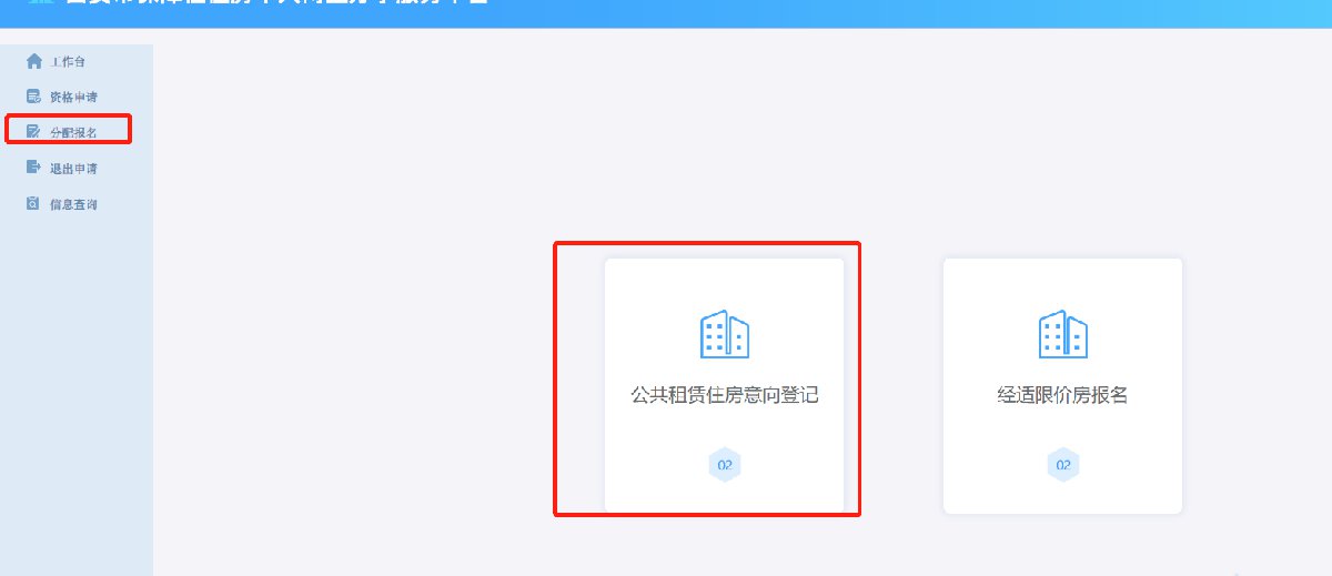 3、登录完成后,页面跳转至西安市保障性住房个人网上办事服务平台工作台,之后选择分配报名,点击公租房报名,进行报名。