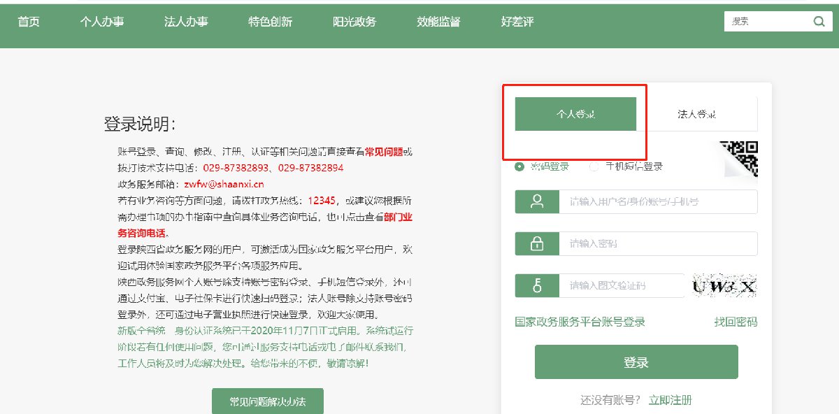 2、点击“个人统一认证登录”,进入陕西政务服务网,选择“个人登录”