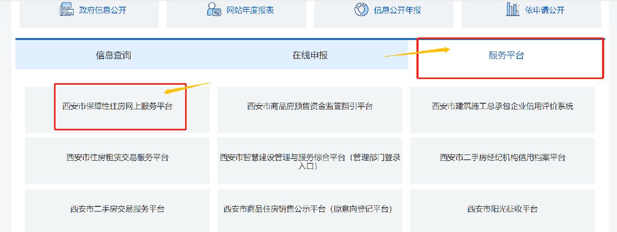 1、通过西安住建局官网“服务平台”栏目,跳转至西安市保障性住房网上平台,如下图