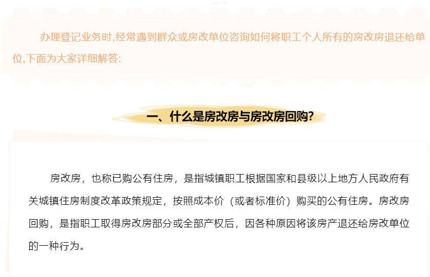 房改房,也称已购公有住房,是指城镇职工根据国家和县级以上地方人民政府有关城镇住房制度改革政策规定,按照成本价(或者标准价)购买的公有住房。房改房回购,是指职工取得房改房部分或全部产权后,因各种原因将该房产退还给房改单位的一种行为。