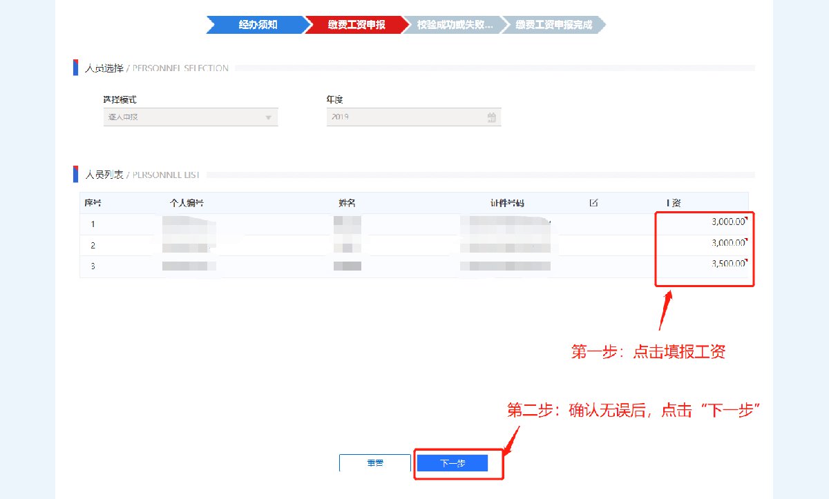 点击工资栏目录入工资,工资录入完成后,点击【下一步】