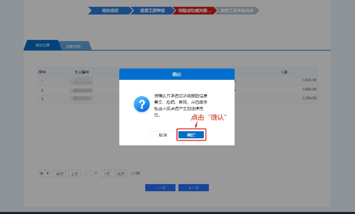 进入页面弹出“单位年度缴费工资申报相关规定”,请仔细阅读后点击【确认】按钮