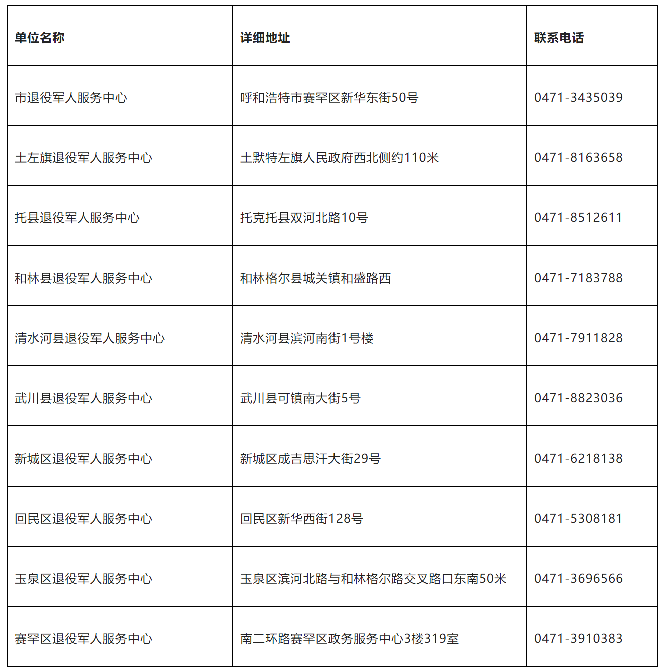 自2022年4月28日起,呼和浩特市将有序开展建档立卡和优待证申领工作,因疫情防控需要,具体按照各旗县区退役军人事务局公布的时间为准。各旗县区退役军人服务中心办公地址及联系电话(见下表)。