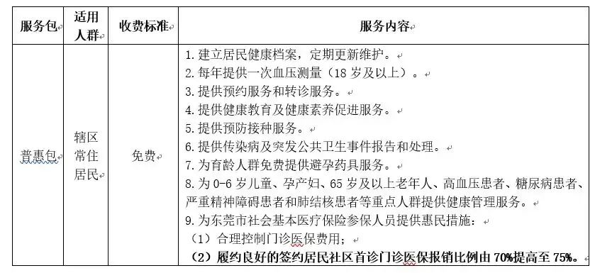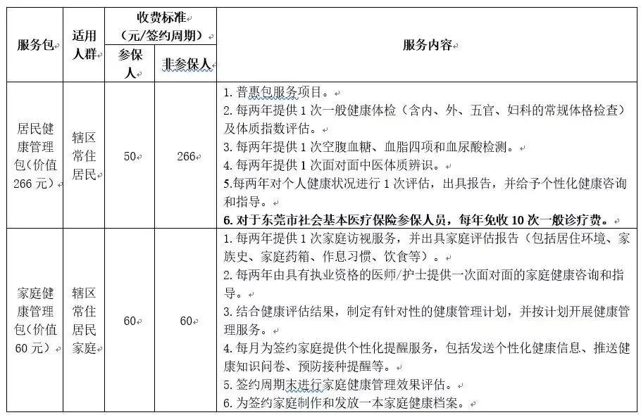 东莞市家庭医生签约服务推行分类签约、有偿签约和差别化签约。家庭医生签约服务包分为普惠包、健康管理包和个性化服务包等三大类11种,其中普惠包为免费,健康管理包和个性化服务包等增值服务包则需按签约周期支付个人的自费部分。参保居民因有医保基金承担部分费用,如果只签约其中一种增值服务包,个人只需自付费用大约27-71元。(参保指已购买东莞市社会医疗保险)