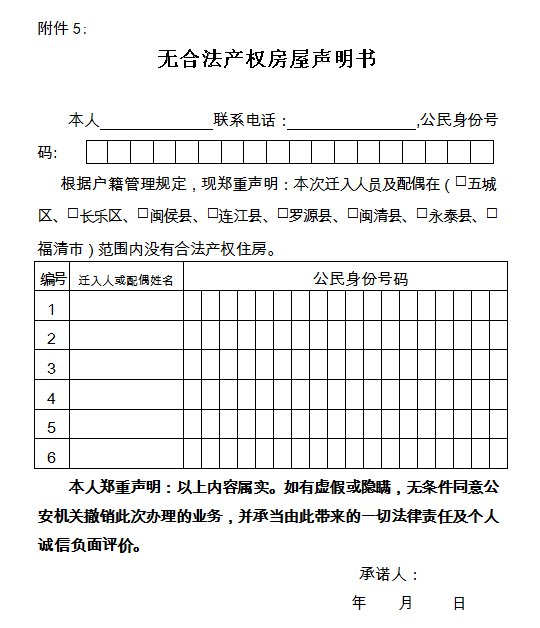 5.迁入人及其配偶在五城区或同一县(市、长乐区)范围无合法产权房屋的声明书