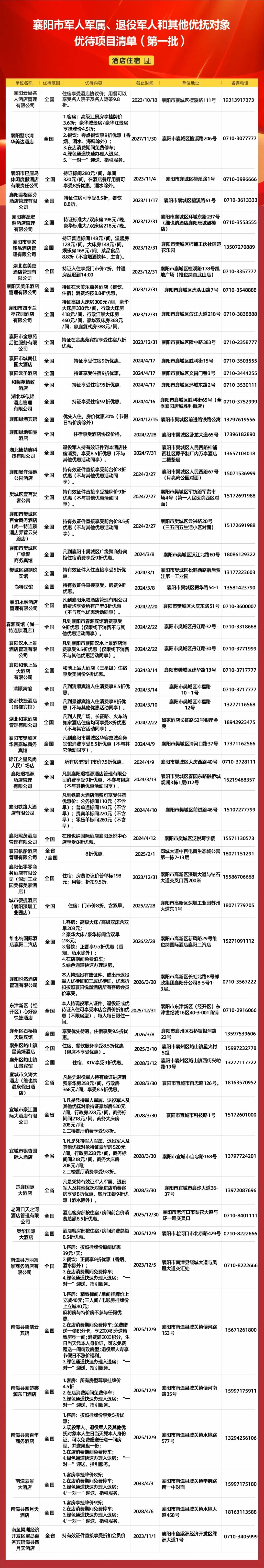 襄阳市公布军人军属、退役军人和其他优抚对象优待项目清单(第一批),全市12个县(市、区)、开发区共签约了311个优待项目,推出各种打折、优惠活动,涉及餐饮、住宿、购物、文化、旅游、医疗、交通、教育等9大类,持优待证、军官证、士兵证等有效证件即可享受优惠优待。