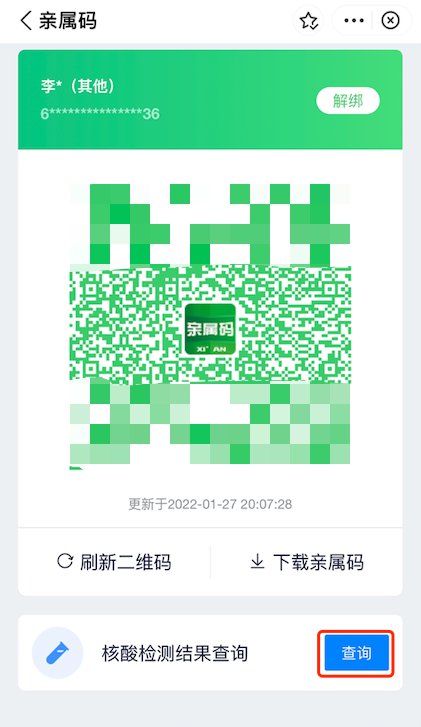 拓展阅读:西安老年人因为不会使用或没有智能手机,进行核酸检测遇到困难,可由亲属绑定亲属码,进行核酸检测时,出示打印的亲属码即可。