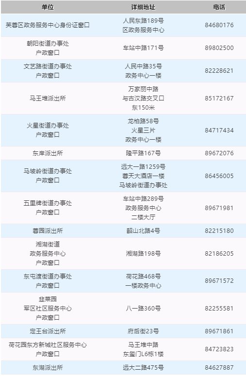 2、芙蓉区所有公安派出所居民身份证窗口、部分街道(社区)身份证窗口。