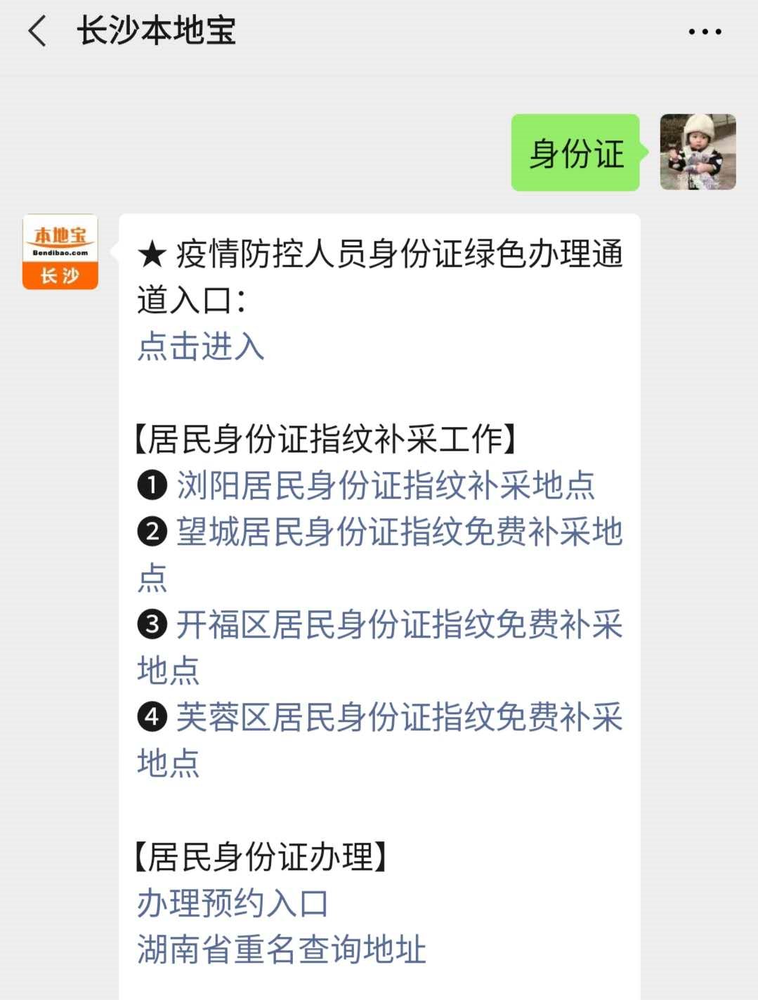 进入我们的微信公众号“长沙本地宝”(微信ID:cshabdb),回复:身份证,就可以查看长沙芙蓉区身份证指纹补采地点。