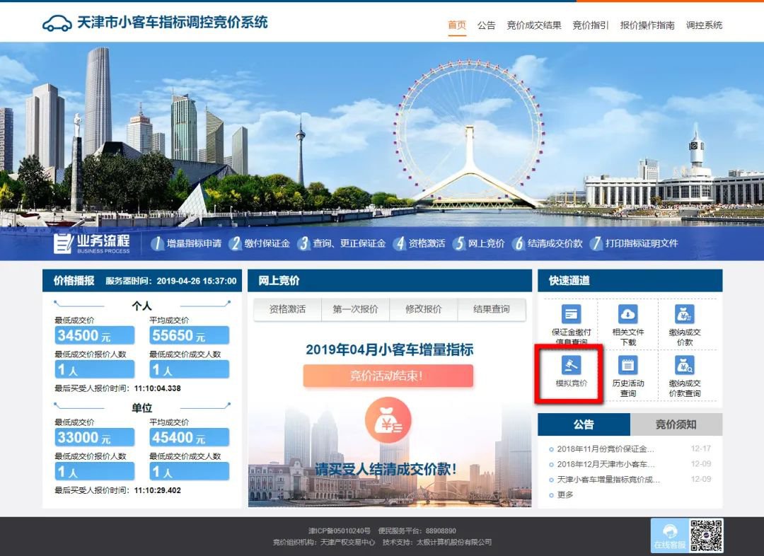 竞买人登录天津市小客车总量调控竞价系统进行模拟竞价,熟悉竞价操作。模拟竞价过程中的报价数据不做任何保存。模拟竞价的入口如下图红框中所示: