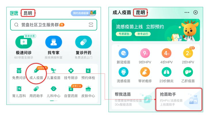 第一步:进入预约入口,选择“昆明”地区,点击首页“成人疫苗”,进入后再点击“抢苗助手”;