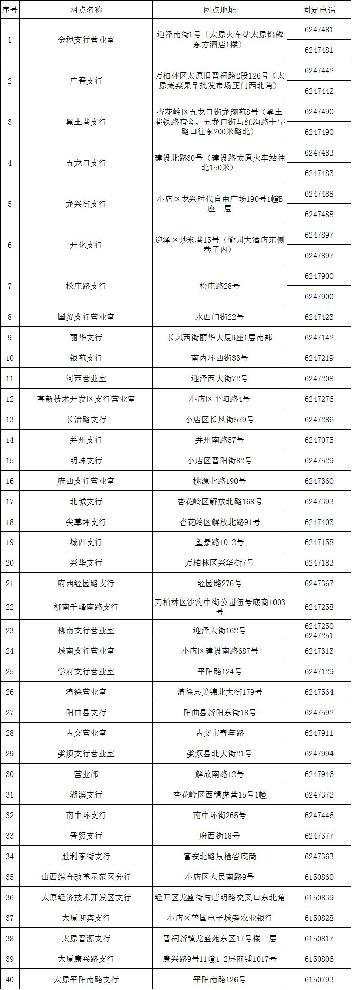 广晋支行,万柏林区太原旧晋祠路2段126号(太原蔬菜果品批发市场正门西北角),6247442、6247442