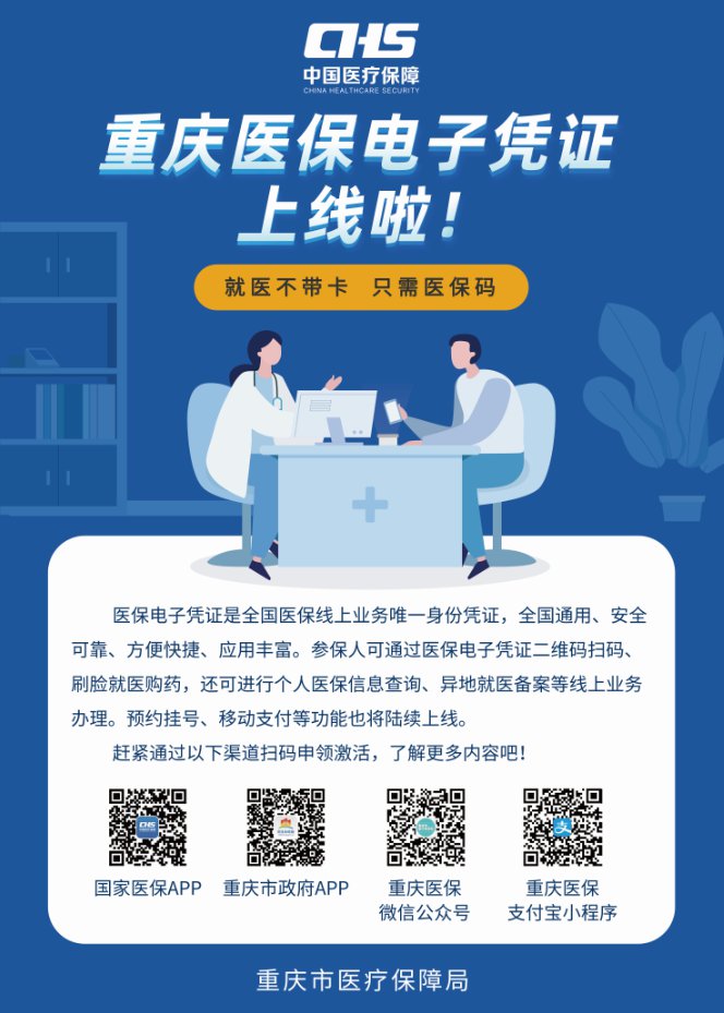 医保电子凭证不依托实体卡,参保人可通过国家公共服务平台APP、重庆市政府APP、重庆医保微信公众号、重庆医保支付宝小程序等医保部门认证授权的第三方渠道激活使用,十分方便;