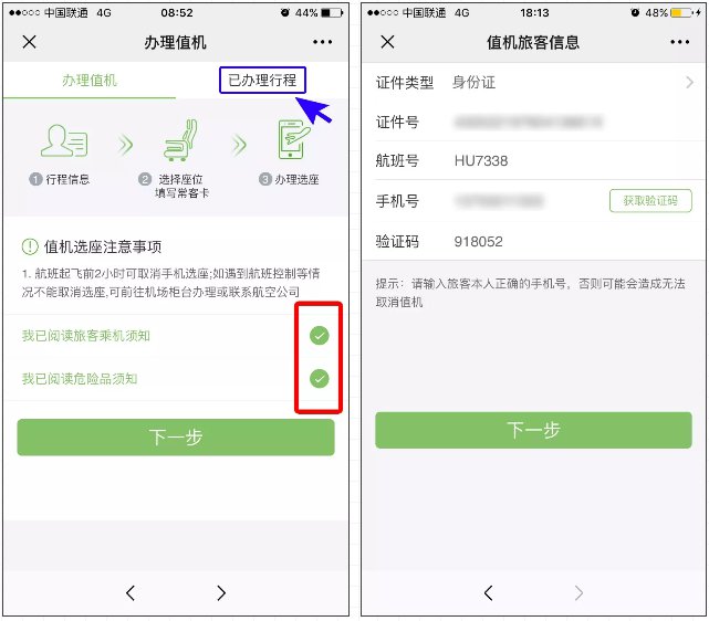 4、阅读了相关须知后,填写证件信息、航班号后进行手机验证,然后就可以开始值机选座;