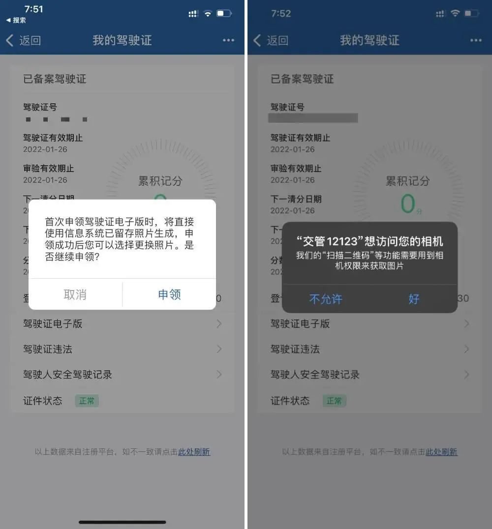 2、点击「驾驶证电子版」将出现提示,告知申领成功后可替换照片。点击「申领」,将申请访问相机权限,点击「好」即可进行下一步。