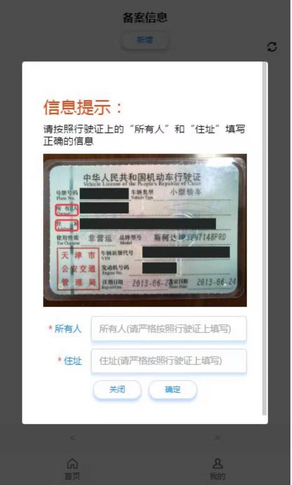 六、添加备案信息后点击图 6 中的“车辆列表”按钮进入如图 10 所示车辆列表页面。点击图 10 中“新增”按钮进入如图 11 所示页面添加车辆信息,点击所有人姓名输入框可选择已添加的备案信息中的所有人姓名。