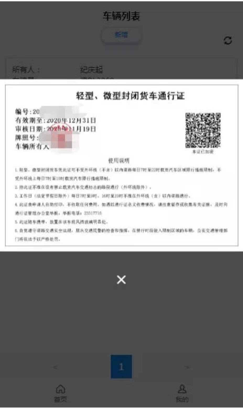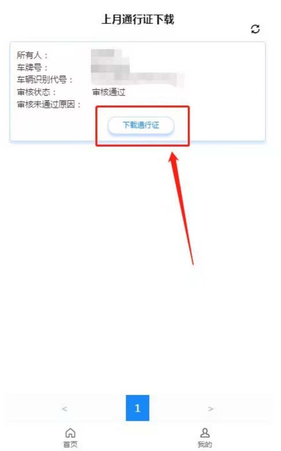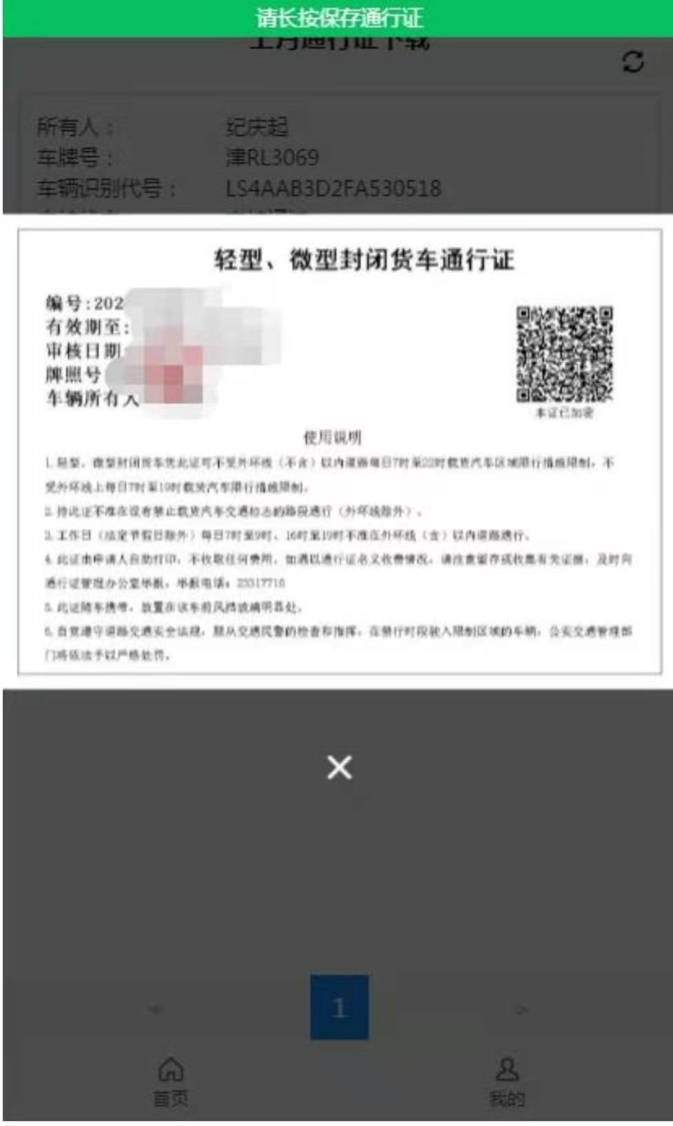 点击如图 6 中“上月通行证下载”按钮进入如图 15 所示的页面查看上月申请通过本月可用的通行证信息。点击如图 15 中“下载通行证”按钮弹出如图 16所示的页面。长按图 16 中的通行证图片可以将电子版的通行证保存到手机相册中。