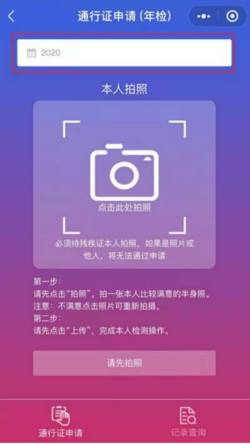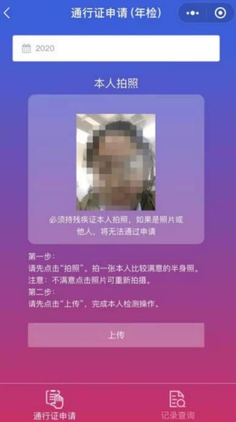 选择好年份后,点击图 2 中的“点击此处拍照”在拍照页面中,残疾人本人进行人脸拍照如图 3 所示,拍照完成后点击“上传”按钮对拍摄的人脸照片进行上传,上传成功即说明通行证申请(年检)数据提交成功,并会自动跳转到记录查看页面。