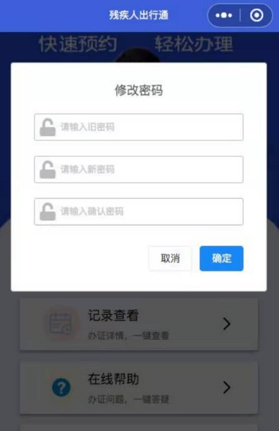 残疾人用户可点击首页中的“修改密码”进入到修改密码页面,输入旧密码、新密码及确认密码,然后点击“确认”按钮完成对登录密码的修改。