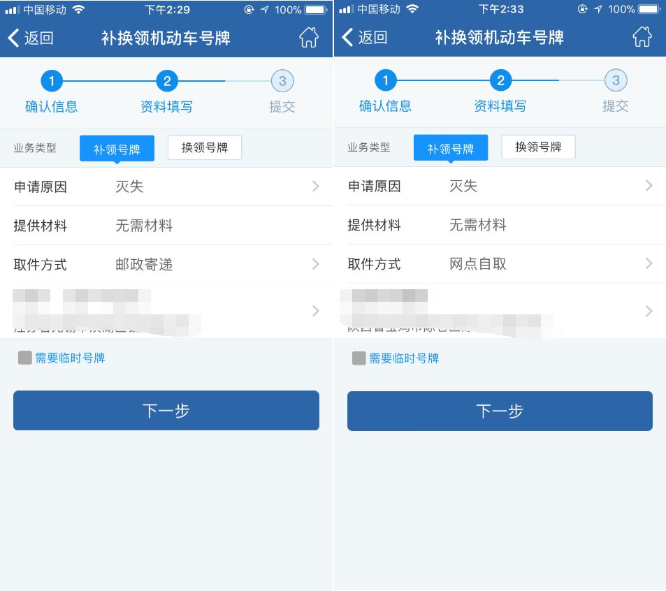 点击【下一步】,进入资料填写页面,填写业务类型、申请原因(号牌灭失或丢失)、是否需要临牌、取件方式、临牌邮寄地址和机动车号牌上牌点等资料信息。业务类型:用户可以选择补领号牌或换领号牌。换领号牌需将原号牌交回,邮政工作人员会上门收取牌证。