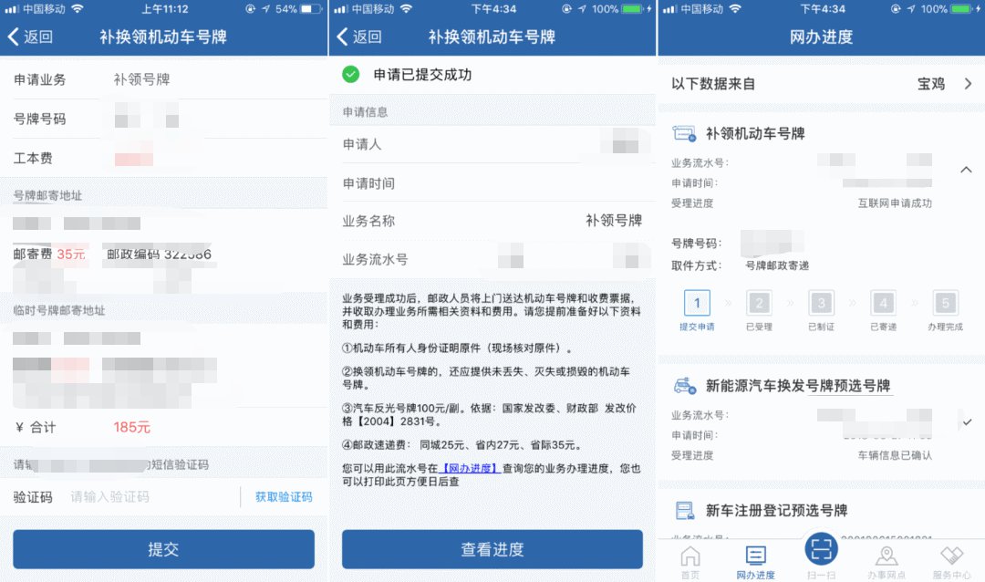 资料填写完成后,点击【下一步】,进入补换领号牌提交页面,确认所填资料信息无误后,获取手机短信验证码,核验通过,点击【提交】按钮,完成补换领牌证业务申请信息提交。提交成功后,用户可通过【首页】→【网办进度】功能随时查看业务办理进度,车管所工作人员将在1个工作日内完成业务受理。