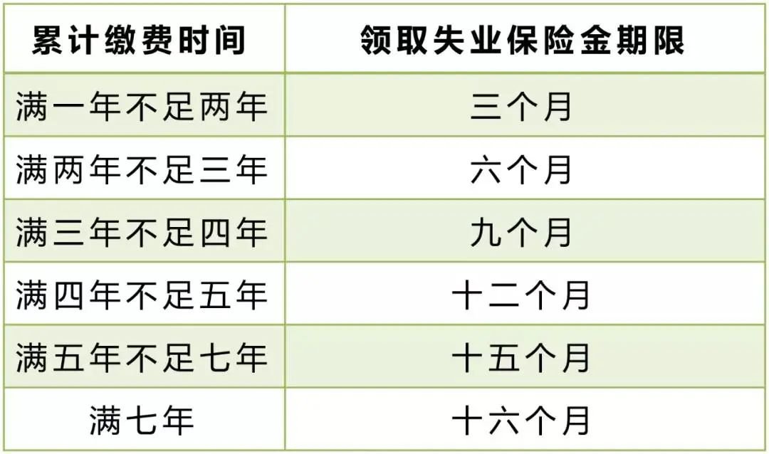 累计缴费时间每增加一年,领取期限增加一个月,最长不超过二十四个月。(8年为17个月、9年为18个月、10年为19个月、11年为20个月、12年为21个月、13年为22个月、14年为23个月、15年为24个月)