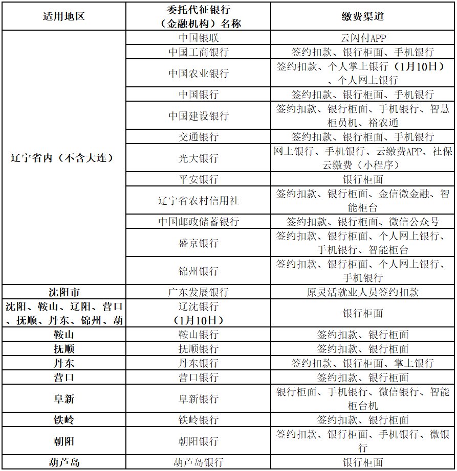 各委托代征银行(金融机构)于2022年1月5日8:30对外提供以下缴费服务:(见下表)