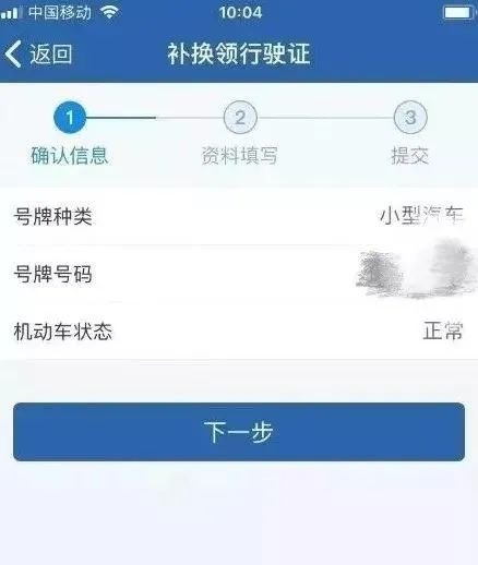 第三步:进入确认车辆信息页面,包括号牌种类、号牌号码、机动车状态。