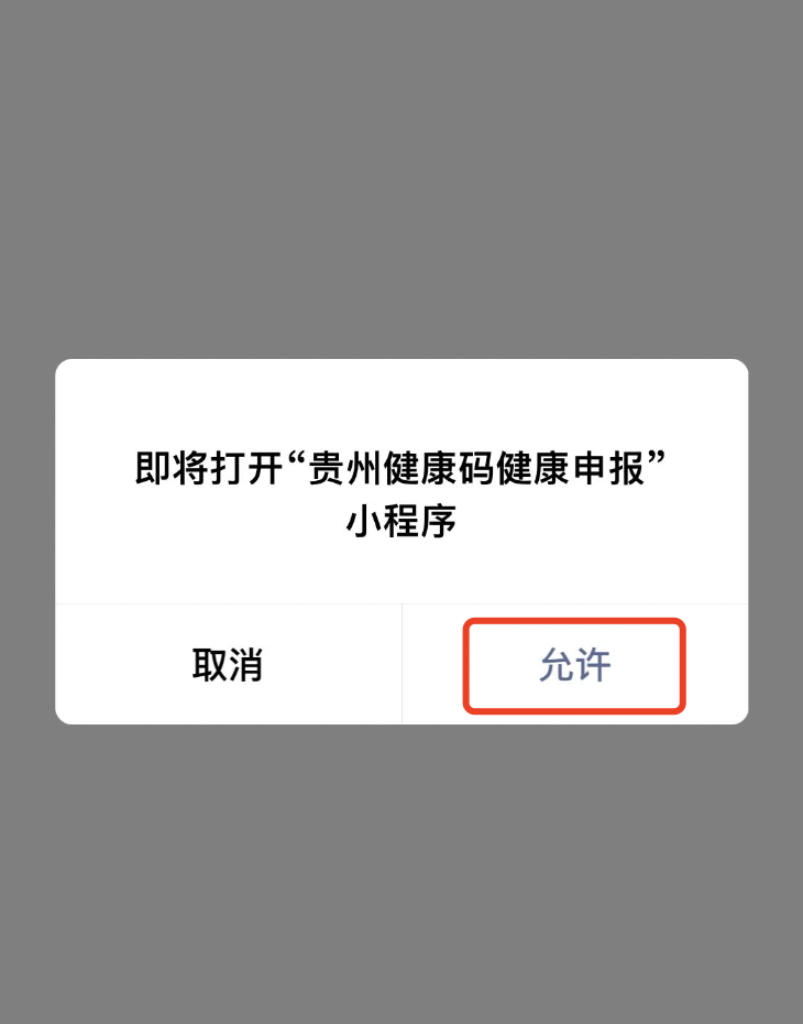 在贵州健康码首页,点击“健康申报”按钮,提示即将打开【贵州健康码健康申报】小程序,点【允许】直接进入“健康申报”页面。