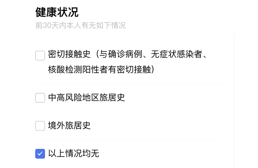 健康申报完成后会在健康申报页面顶部生成一个二维码,通过机场或车站管控卡口时出示二维码或身份证,扫码设备识别结果为正常方可通行。