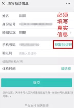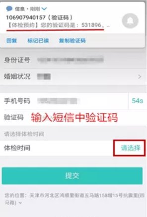 第十步,收到验证码信息,填写验证码,点击“请选择”,选择体检时间。