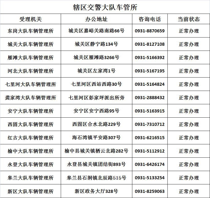 兰州新车上牌地址(部分):
