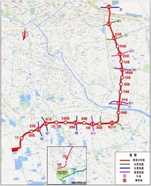 线路走向:起点处线路自西向东沿梨园头车辆段北侧规划道路敷设,在车辆段咽喉区转向北下穿出入线及中兴路。线路终点与10号线一期工程起点相接,实现贯通运营。本线长度1.32km,设置1座车站,位于梨园头车辆段北侧。