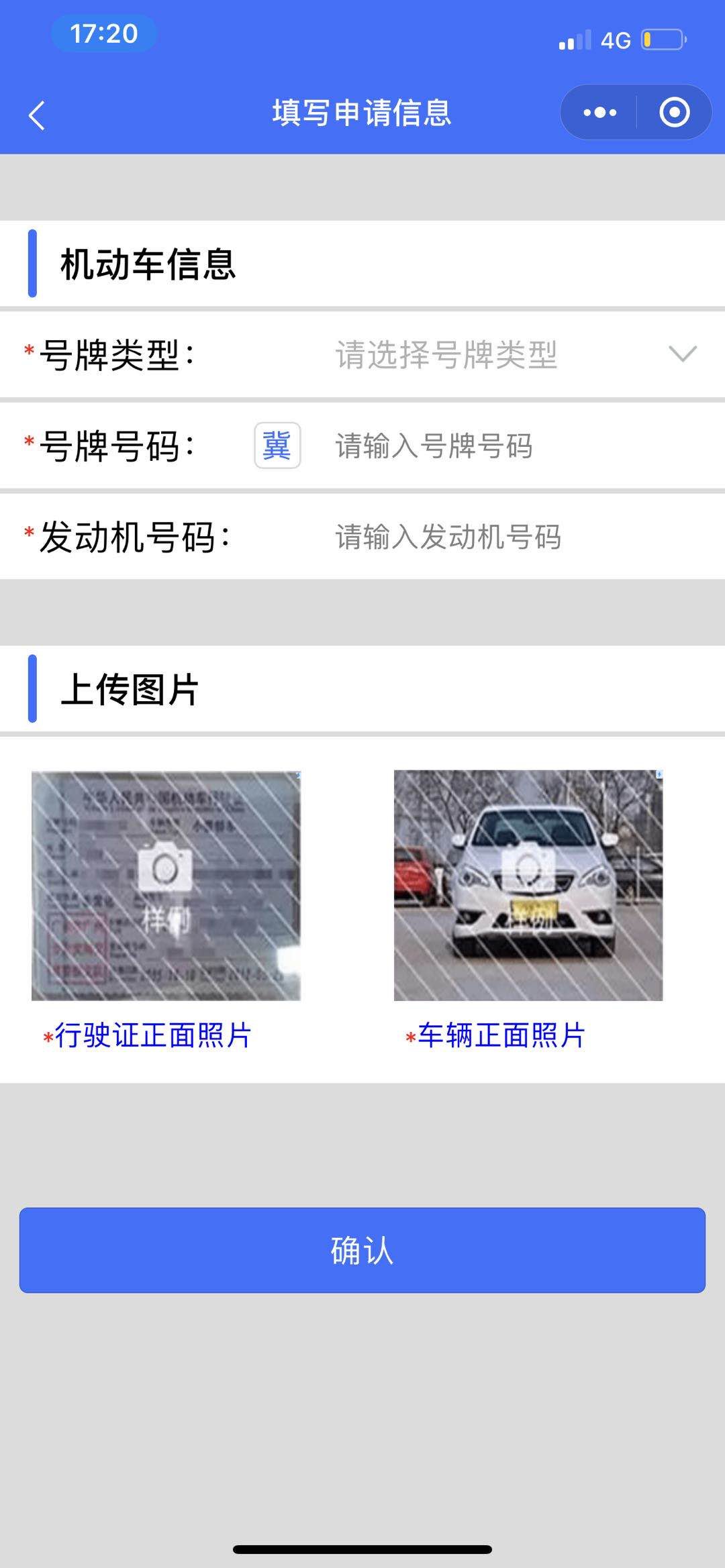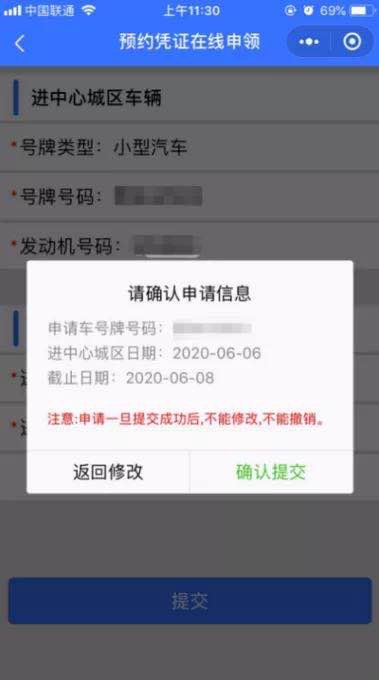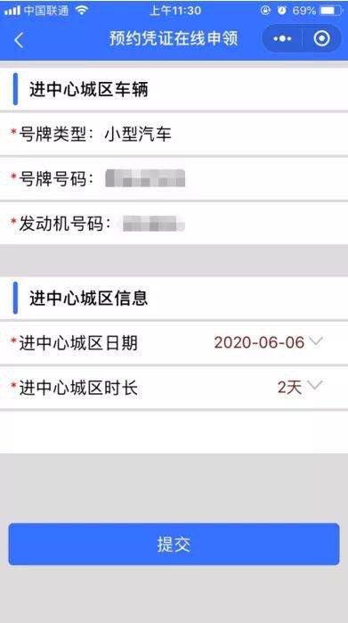 2.在页面中输入车辆信息,并上传行驶证正面照片、车辆正面照片,“确定”并进入高峰预约在线申领页面,选择进中心城区日期(用户可提前一至四天预约办理)和进中心城区时长(可选择1-7天)提交。