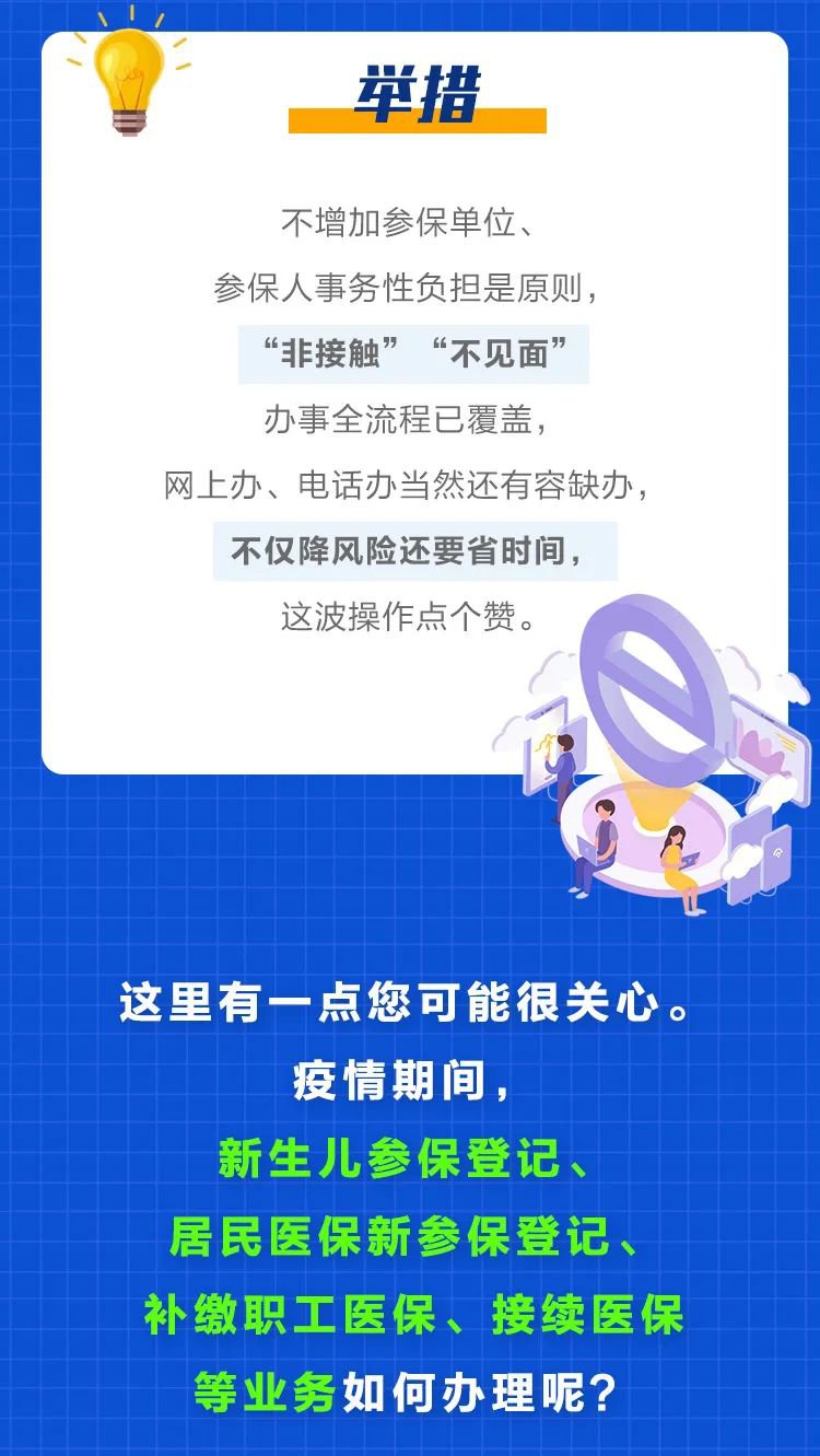 在疫情防控期间,参保人如逾期办理新生儿参保登记、停断保接续手续、退休人员不足年限补缴、生育待遇领取等手续的,在疫情解除前,疫情防控期不计入办理时间期限的计算。参保人可在疫情解除后办理相关手续,按规定补办后不影响个人权益记录和待遇享受。同时,全市医保部门畅通异地就医备案电话,引导参保人通过电话办、传真办、邮件办、手机办、网上办等各种形式办事。