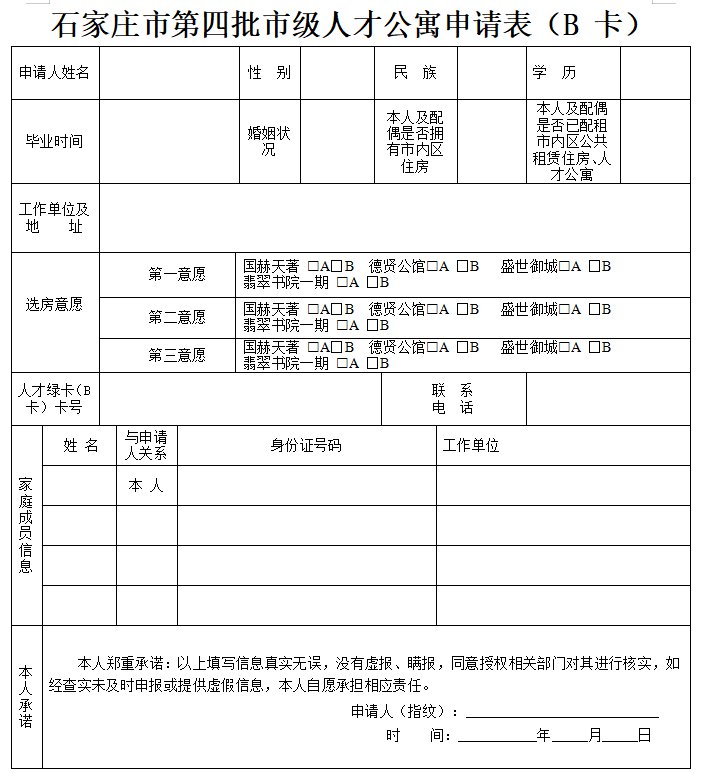 石家庄市第四批市级人才公寓申请表(B 卡)