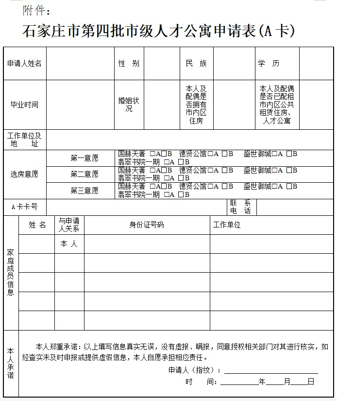 填表说明:1、选房意愿中A、B户型分别表示一室和两室。2、每一个选房意愿只能选一个小区一种户型,多选无效。3、申请表一式三份,用人单位、各区人社局或市直有关部门、市人社局各一份。4、本表中市内区是指长安区、裕华区、桥西区、新华区和高新区、循环化工园区、自贸区正定片区。部分工作在县区市直事业单位是指办公地点在栾城区、藁城区、鹿泉区、正定县的市直事业单位,人才同时填写工作当地县区房产情况。