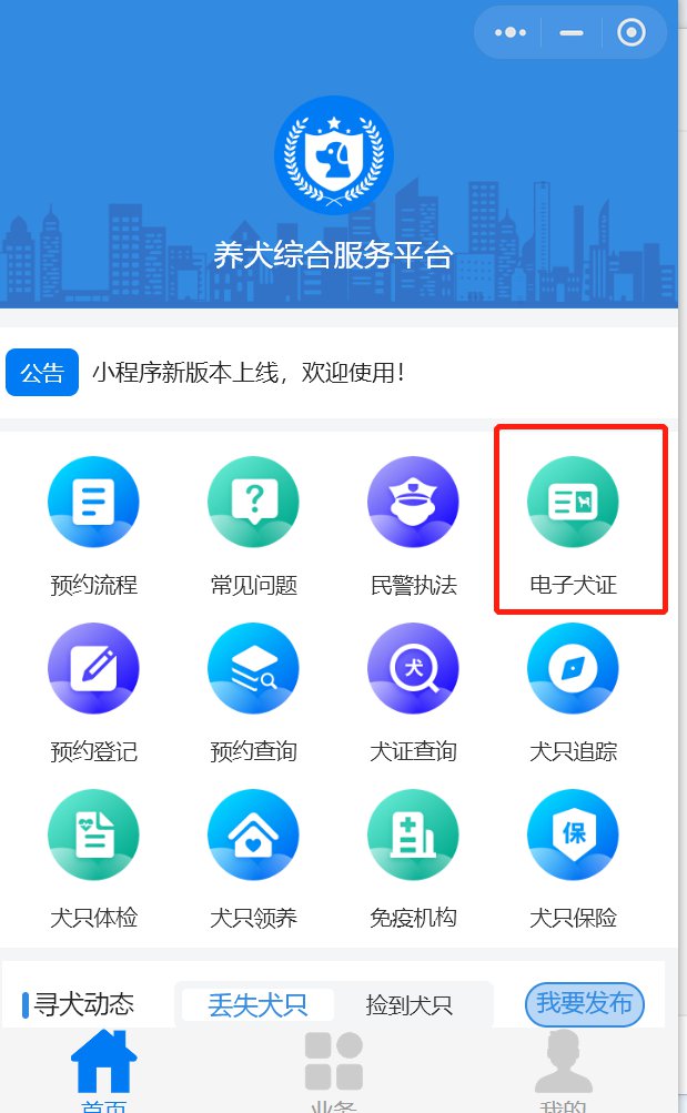 2、可通过“电子犬证“功能,此功能只局限于用微信公众号预约办理犬证的用户直接查询并调取。
