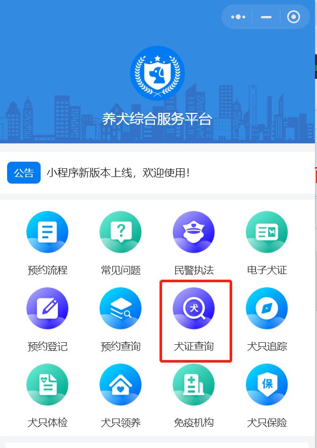 1、可通过“犬证查询”功能,此功能可供持有养犬登记证的任何用户统一查询或下载保存;
