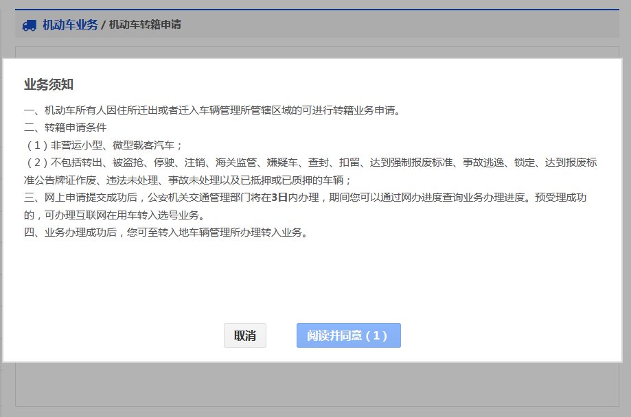 【选择机动车】→ 【选择转入地】→ 【阅读业务须知】→ 【确认提交】