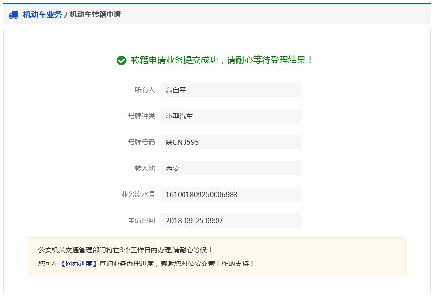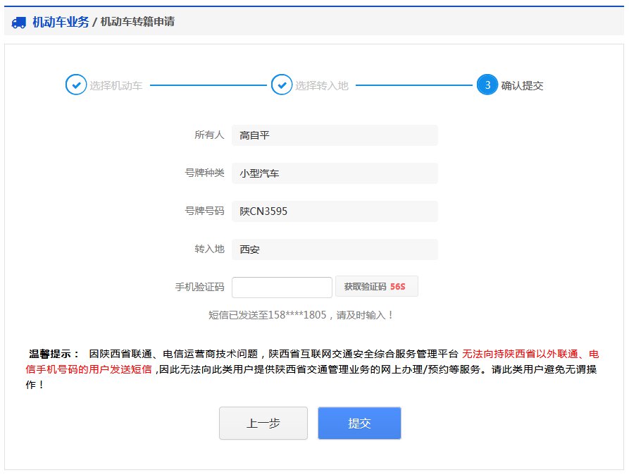 该步骤显示用户的车辆信息、转入地信息。