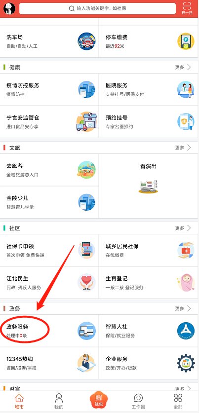 1、下载、打开并登陆“我的南京APP”,找到首页政务—政务服务;