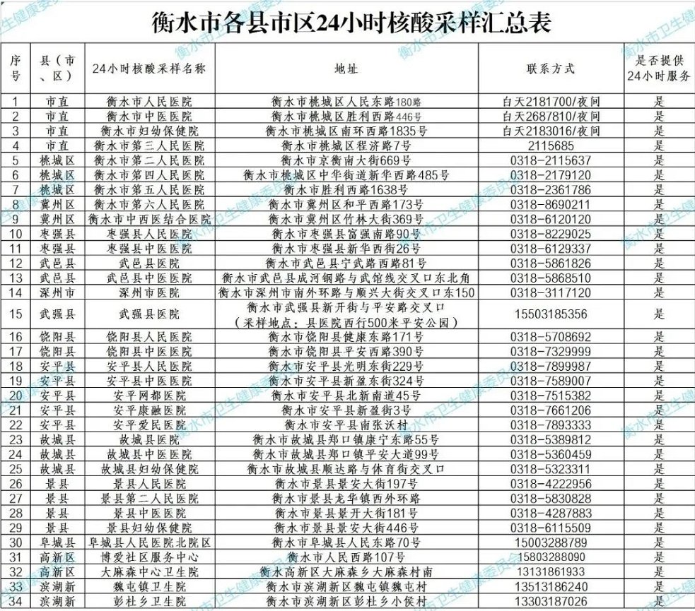 为方便市民查询和就近选择核酸检测采样服务,衡水市卫生健康委员会对全市提供24小时核酸检测服务的机构信息进行了汇总。